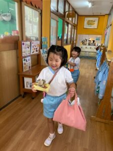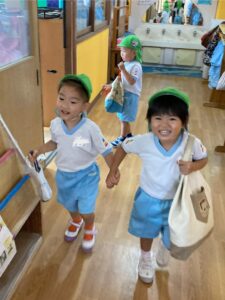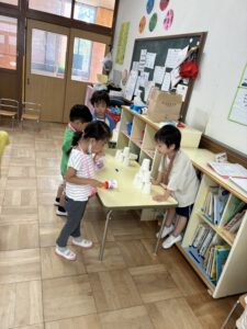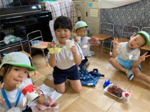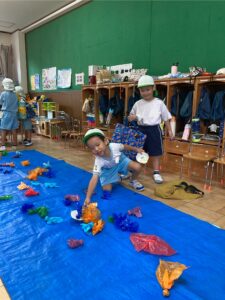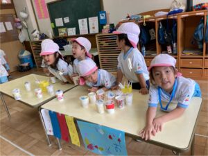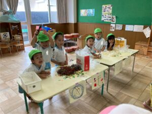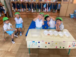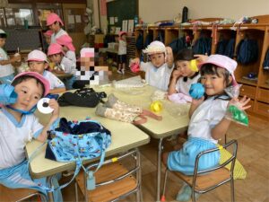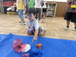 夏休みが明け、みんなの夏祭りに行った話を聞いて年中組で夏祭りをしました!