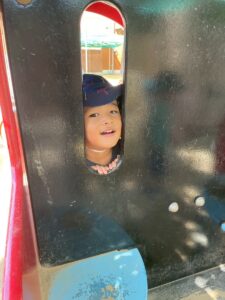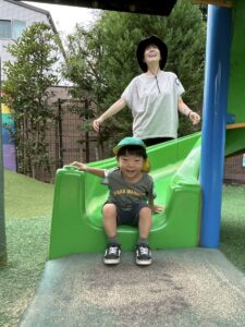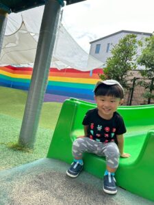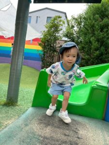 滑り台を滑った後は笑顔が弾けています♪