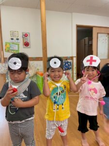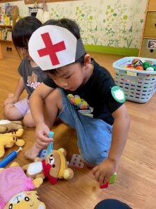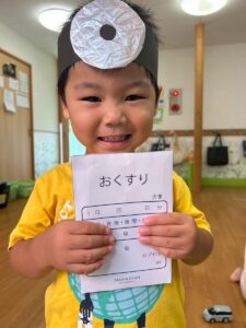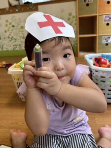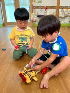 「喉が赤いですね」「チクっとしますよ~!!」「おくすり飲んでくださいね~」などなど、お医者さんのまねっこをして楽しんでいます!