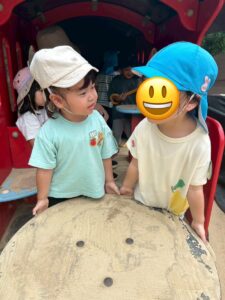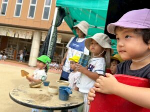 お砂場では子ども達同士のやり取りが増えてきました。