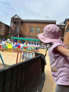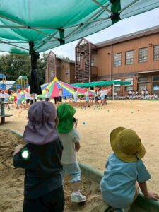 幼稚園のお兄さん、お姉さんの運動会の練習にも興味津々ですよ。