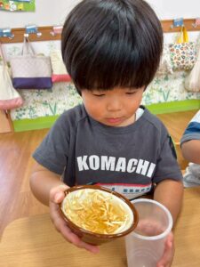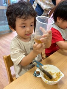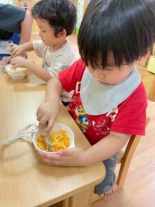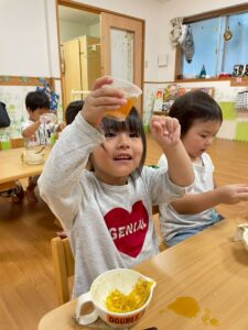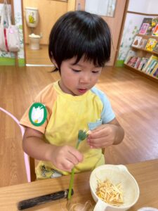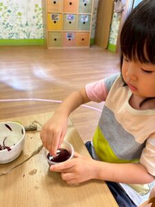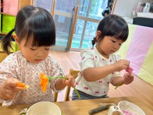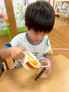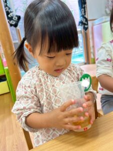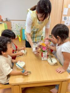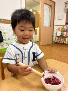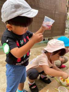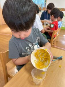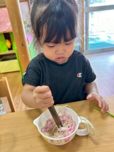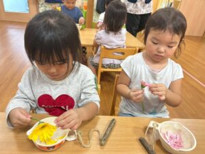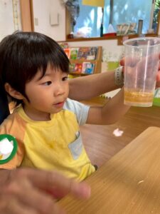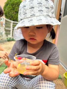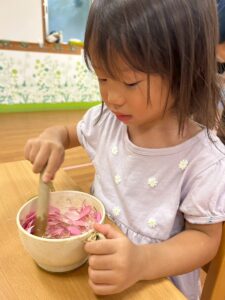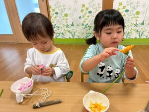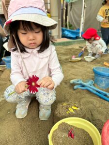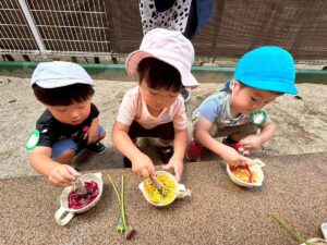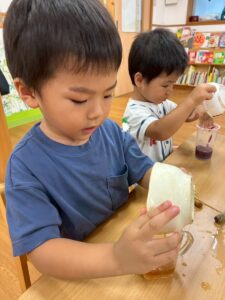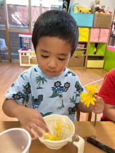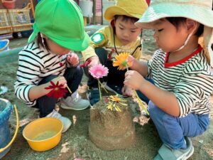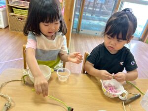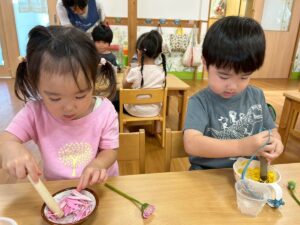 きれいなお花を頂いて、みんなで見て楽しんだ後、色水遊びをしました。