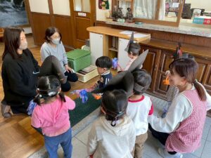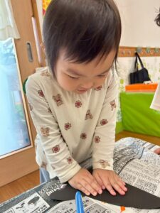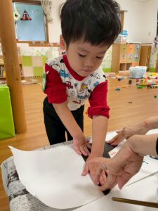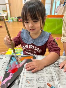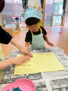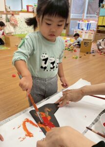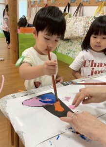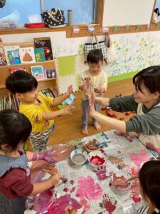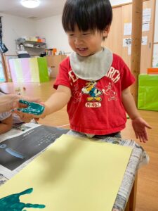 筆で手のひらに絵具を塗ると、くすぐったくてニコニコの子やちょっぴり気持ち悪くて渋いお顔になる子、子ども達の反応も様々でした。