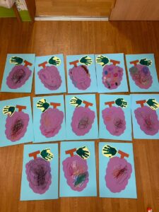 みんなが大好きなぶどうに、今しかない小さな小さなかわいい手形の葉っぱをつけてかわいい作品が出来上がりました。