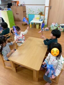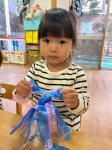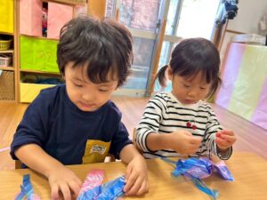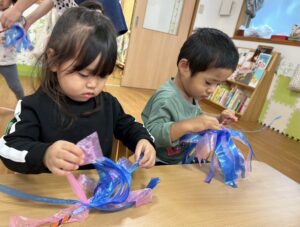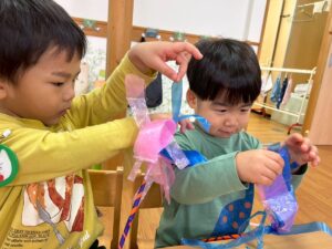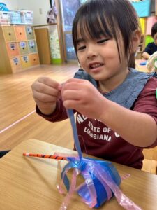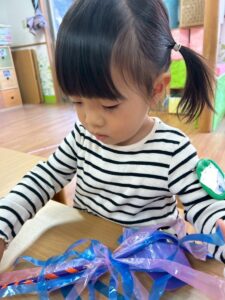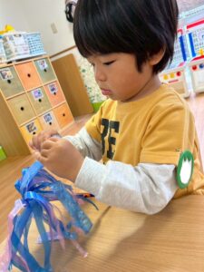 「ふわふわのステッキにしよ~!!」っとスズランテープをさきましたよ。