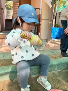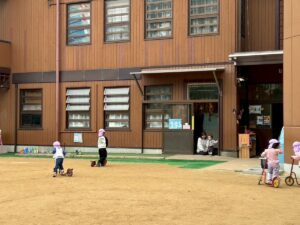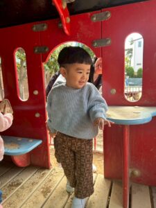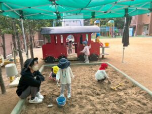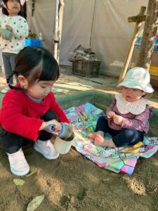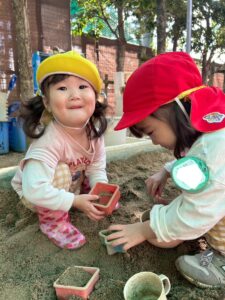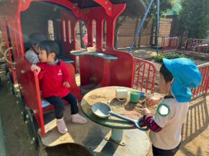 秋日和の、ぽかぽか暖かい日は園庭に出て遊んでいます。