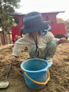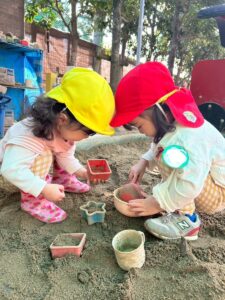 バケツやコップにお砂を入れてプリンやケーキを作りましたよ♡