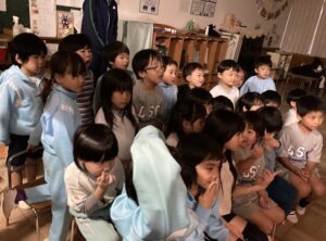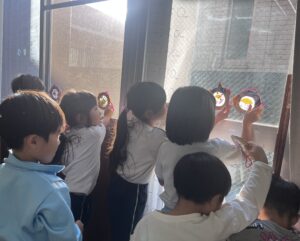自分で描いた絵が照らされて嬉しそうな子どもたち。
