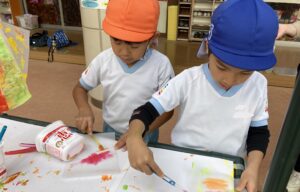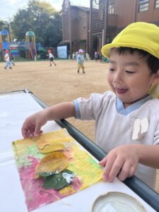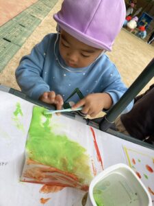 戸外での絵の具遊びは開放的で子どもたちもとても楽しんでいました。