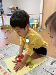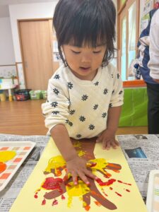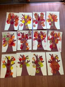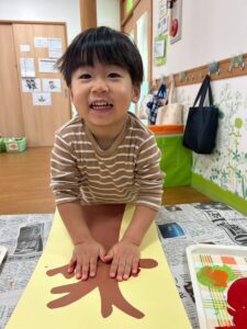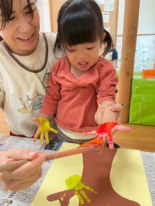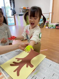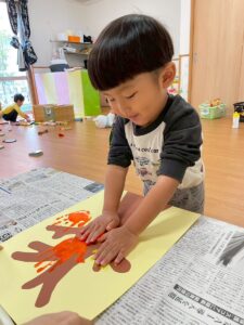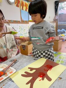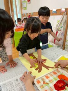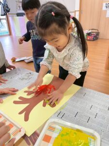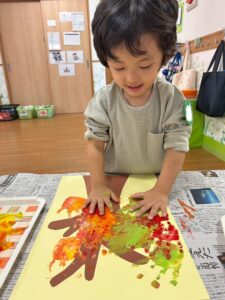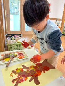 11月の製作は子ども達の可愛い手で紅葉した木を作りました。