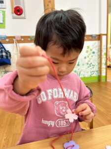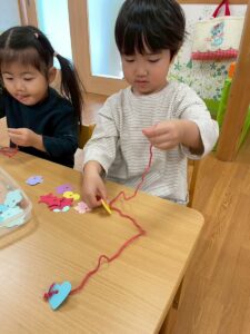 どの形、色の物を通そうかな~っと楽しみながら根気よく取り組んでくれました♪