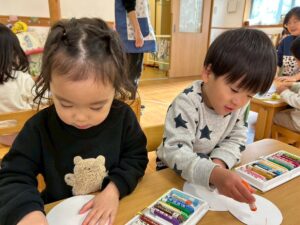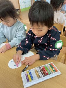クレヨンで雪だるまに目や口、ボタンを描いて~