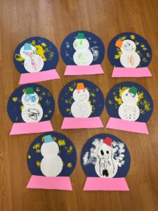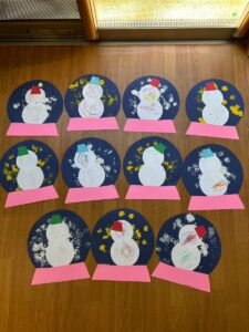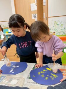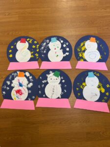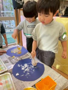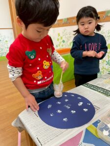 次に子ども達に雪か星を選んでもらって、プチプチで絵の具スタンプをしました!