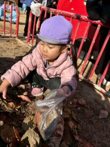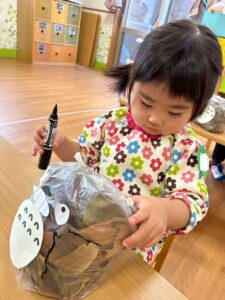 たくさん遊んだ後は、袋に落ち葉を入れてトトロの体づくり!