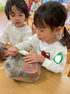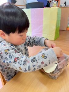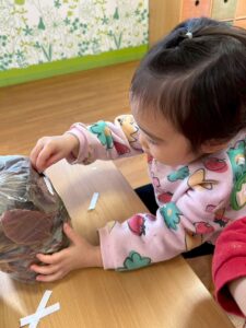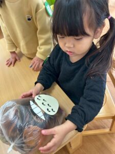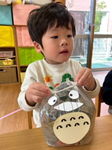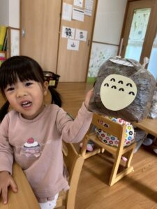 「トトロのおなか破けたらかわいそうだからやさしくね」と伝えたら子ども達も赤ちゃんのお人形を触るように大事に触ってくれましたよ。