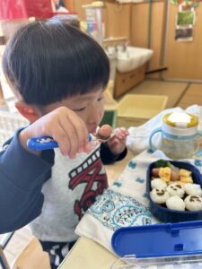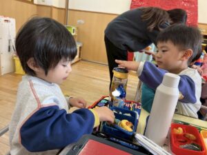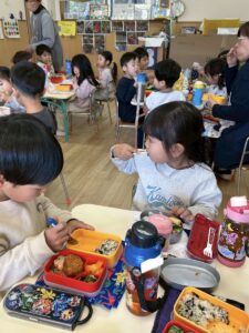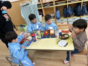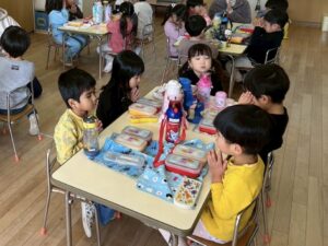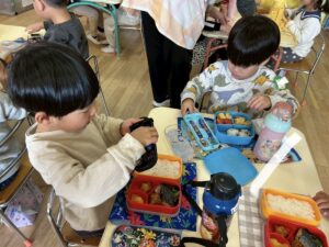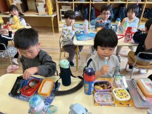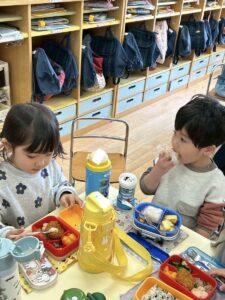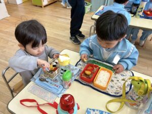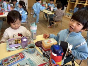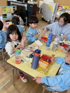 年少組のお部屋にお邪魔して一緒にお弁当を食べました。
