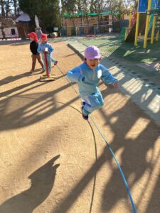 大縄跳びでは「何回跳んだか数えててね!」と言ってくれたり、お友だちや近くにいる子と一緒に縄に入って、大縄跳びをする姿もありました。年少さんは、縄をまたぐ練習として、左右に揺れている縄を跳ぶヘビ跳びをしています😊年長さんが大縄の入り込み跳びに挑戦する姿を見た年少さんが、「入り込みやってみたい!」と年長さんの遊び方に憧れを持つ様子もありました。