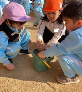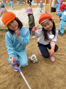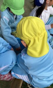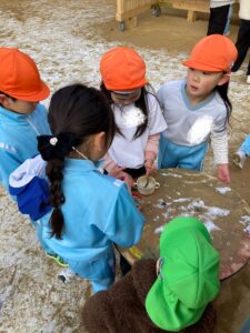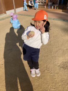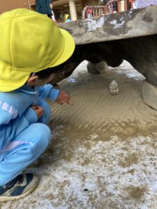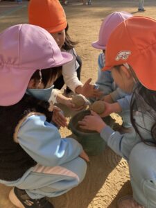 年長さんの作った泥団子が気になる年少さんや、「私の泥団子見せてあげるよ!」と自分で作った泥団子を持ってきて年少さんや先生たちに見せてくれました。