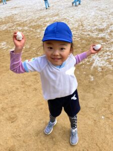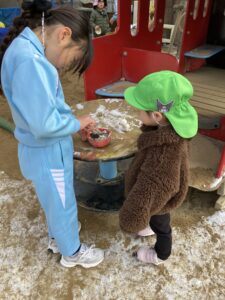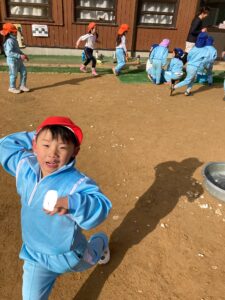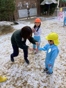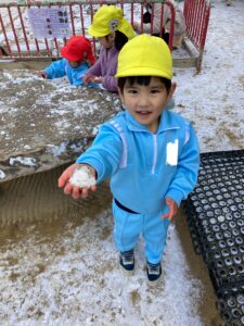 この日のわくわくタイム最後のゲームでは、先生がタライの中に集めた沢山の雪を触って、丸めたり先生やお友だちと雪合戦をしていました。先生や子どもたちから「わー!」「きゃー!」と楽しそうな声が園庭に響いていました🎵