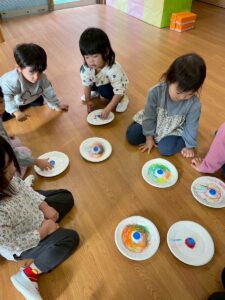 紙皿に色を塗り、ペットボトルのキャップをつけてカラフルなこまを作りました。