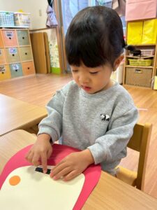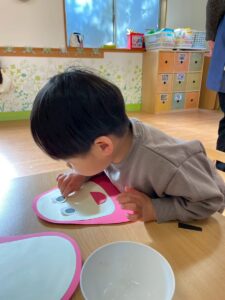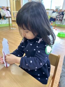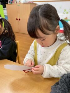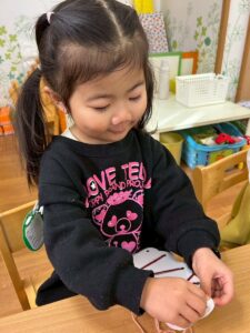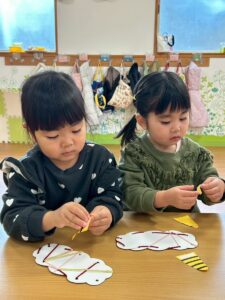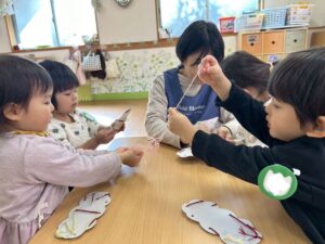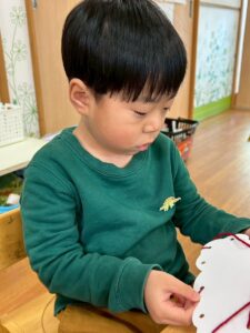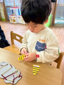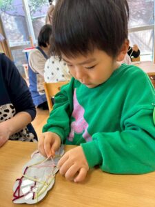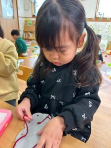 普段の遊びで紐通しもしていたのでみんなとっても上手でしたよ。