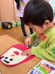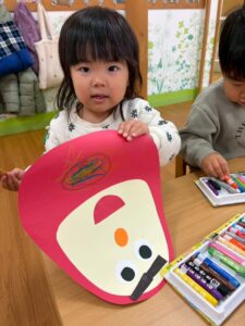 1月は、こま・だるま・鬼のお面とたくさん製作をしました。