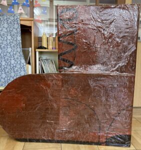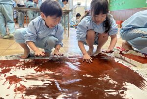 大きな白い紙に茶色と焦げ茶色の絵の具を手で塗っていきました!