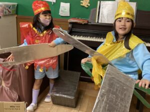 劇で使う道具を自分たちで作ることによって、より親しみを持つことができたのかなと思います♪