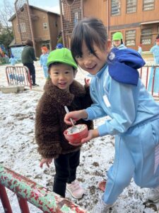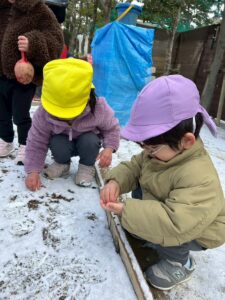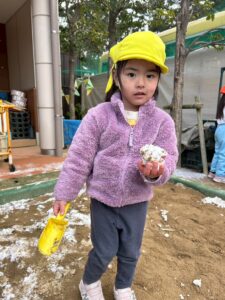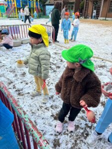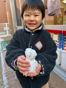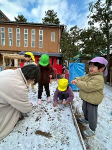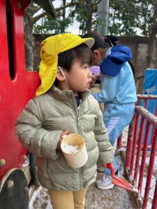 いつもとは違う白い園庭!!雪を夢中になって集めていましたよ♪