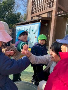 お母さん、お父さんと離れて初めてきりん組に登園した日、子ども達は不安でいっぱいの表情でしたが、今では笑顔いっぱい!言葉も増え自分の思いを伝えようとする姿や友だちを気遣う優しい姿もたくさん見られるようになりました。自分で!!とできることもこの1年でたくさん増えたね。