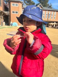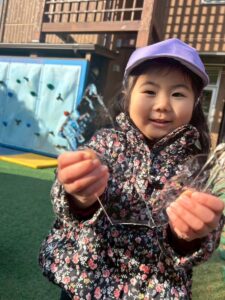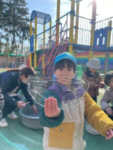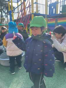 冷た~い!!と言いながらも氷越しにお友達のお顔を見てみたり、バキッと勢いよく割ってみたり!冬の遊びを楽しんでくれました。