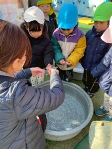 たらいに薄くはった氷もさわりました。
